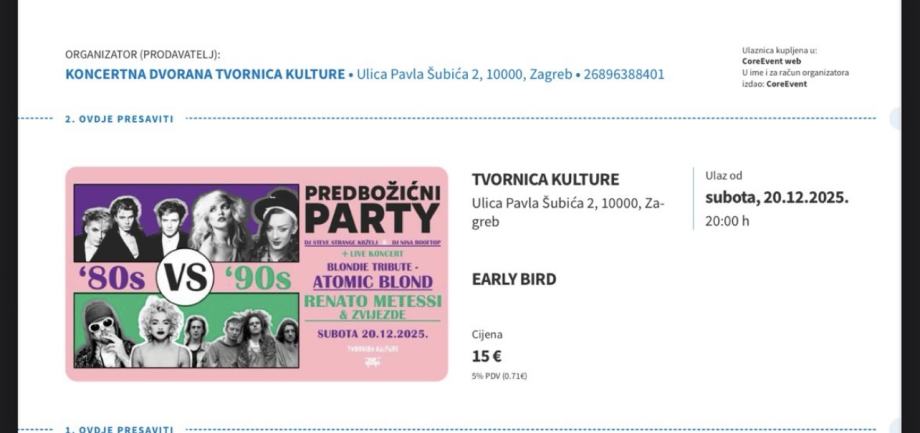Prodajem jednu ulaznicu za 80s VS 90s / DJ PREDBOŽIĆNI PARTY + live RENATO METESSI & ZVIJEZDE / ATOMIC BLOND,