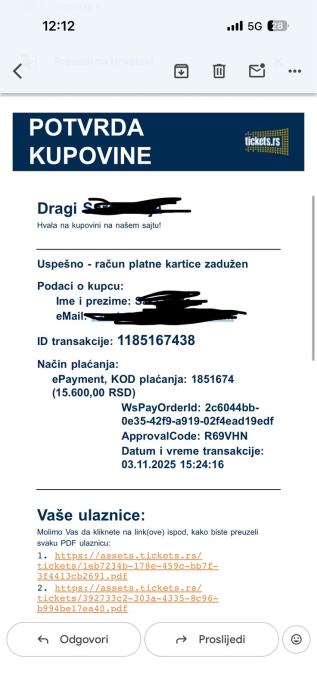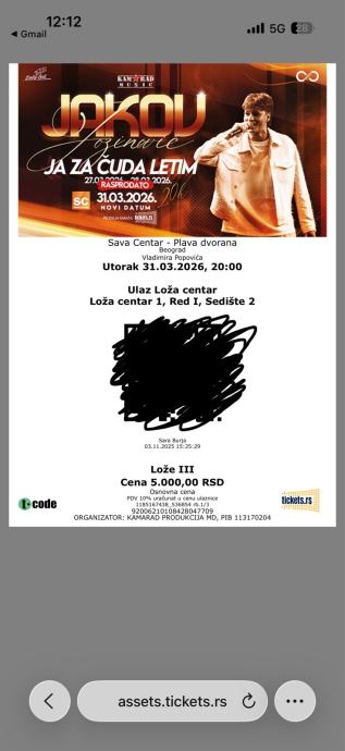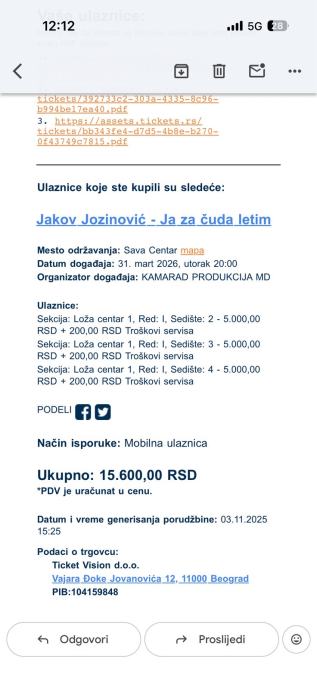 Prodajem tri ulaznice za rasprodani koncert Jakova Jozinovica u Sava centru 31.03.2026. Karte su za lozu.