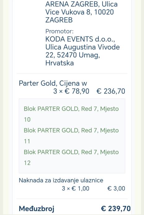 Mjesta za Parter Gold. (Najbolja mjesta u dvorani).