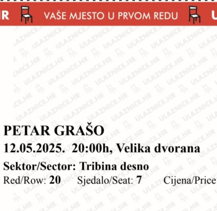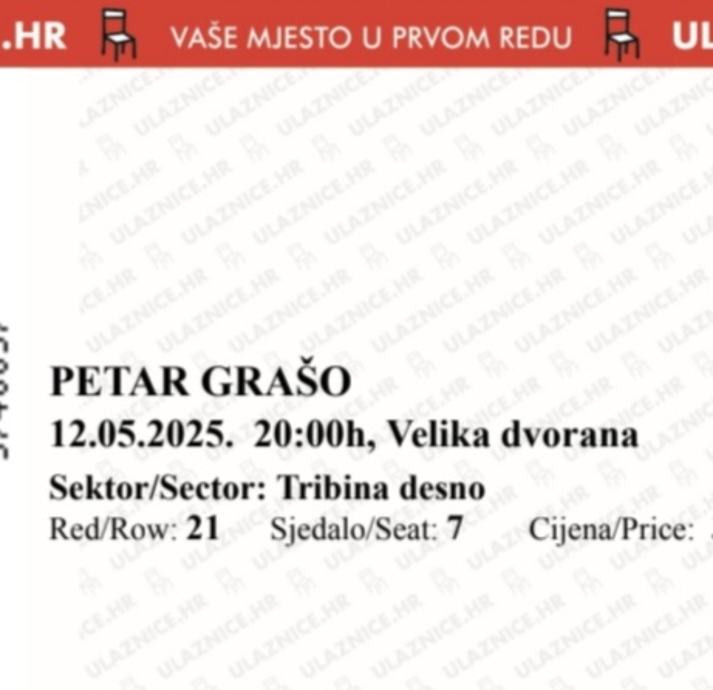 Prodajem ulaznice za prvi koncert Petra Graše u koncertnoj dvorani Vatroslav Lisinski. Na prodaju dvije ulaznice. Cijena po karti 40€