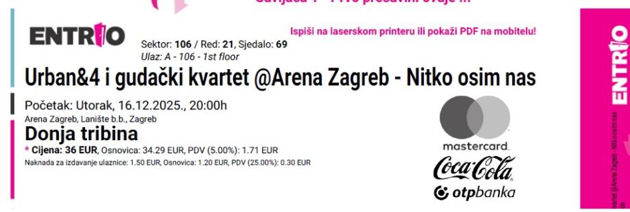 URBAN, 16.12. ARENA ZAGREB - prodajem 2 karte za koncert, donja tribina