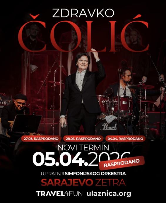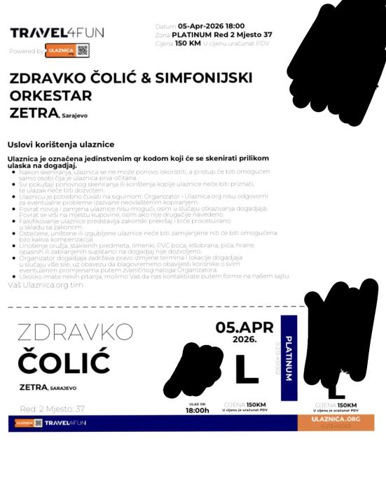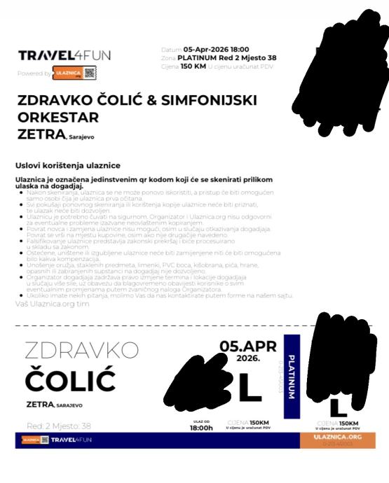 Prodajem 2 karte za koncert Zdravka Čolića u Zetri, Sarajevo (05.04.)