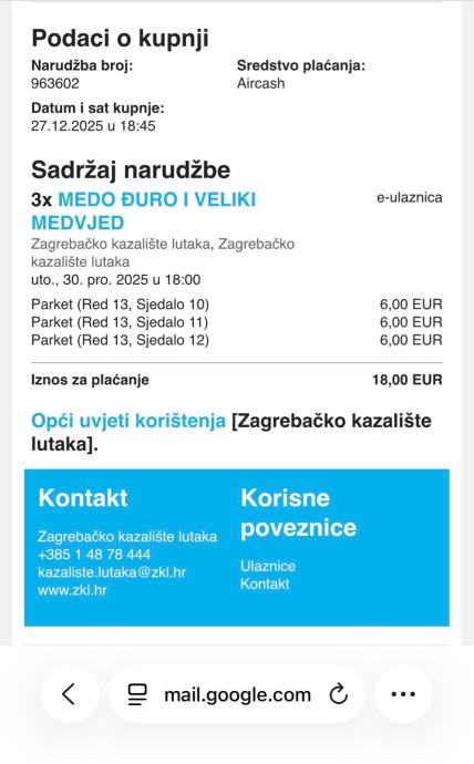 Prodajemo 3 Ulaznice za kazalište večeras za predstavu Medo Đuro i Medvjed u 18.00
