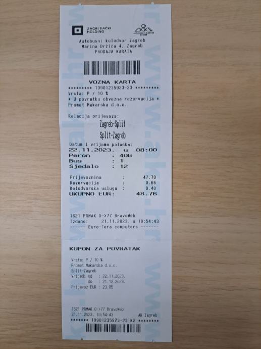 Autobusna karta Split-Zagreb prijevoznika Promet Makarska. Kupon za povratak s izvorno kupljenom povratnom kartom. Vrijedi do 21. prosinca 2023.