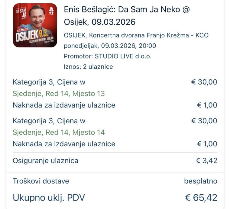 Prodajem dvije ulaznice za Enisa Beslagica u Osijeku, 09.03.2026.