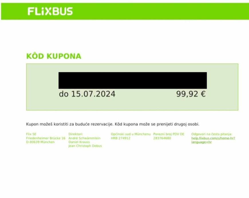 Flixbus kupon od 99,92 € / prodajem za 90,00 € / vrijedi do 15.07.2024