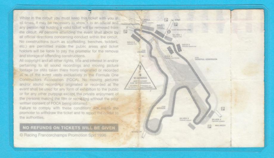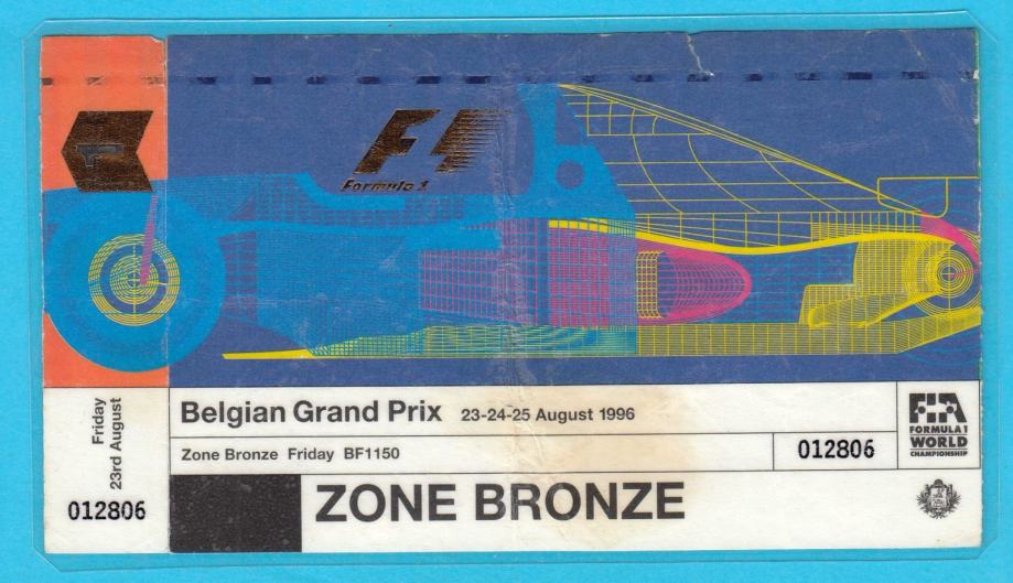 Stara originalna ulaznica za F1 spektakl - 1996 Velika Nagrada Belgije (Belgian Grand Prix).