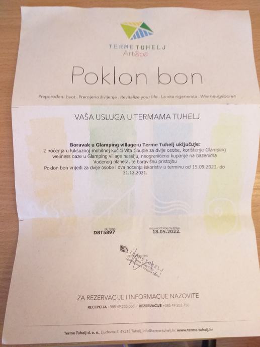 Prodajem, poklon bon, dobiven u nagradnoj igiri (Alianza), nažalost nisam u mogućnosti iskoristiti poklon bon te ga moram prodati. Bon vrijedi do kraja 2021. godine, uključuje 2 noćenja u Vita Couple apartmanu, korištenje welnessa u naselju i neograničeno kupanje na bazenima Vodenog parka te boravišnu pristojbu.
