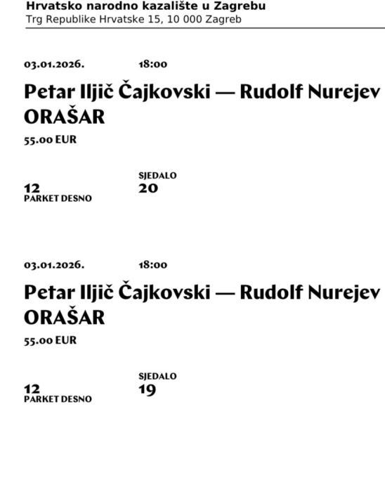 Prodajem dvije ulaznice za popularnu božićnu predstavu Orašar u Hrvatskom narodnom kazalištu u Zagrebu.