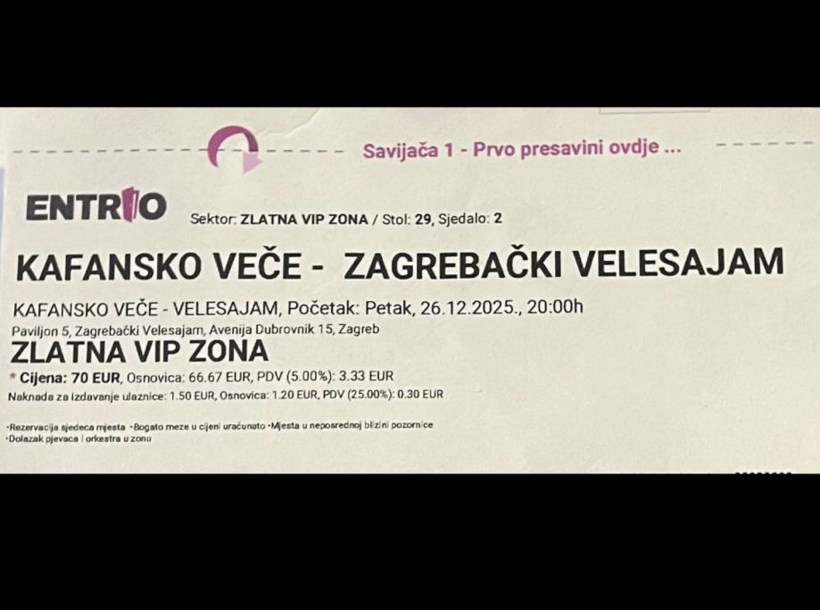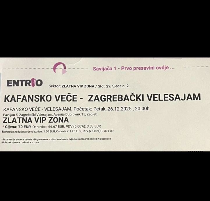 Prodajem 2 karte u Zlatna Vip zona stol br 29 Kafanako Vecer Zagreb Velesajam 26.12.2025 po cijeni kojoj su kupljene 70€ javiti se na br mob:098 9399477