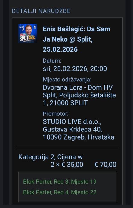 Prodajem 2 ulaznice(70 €) ,za predstavu ENISA BEŠLAGIĆA,"DA SAM JA NEKO"