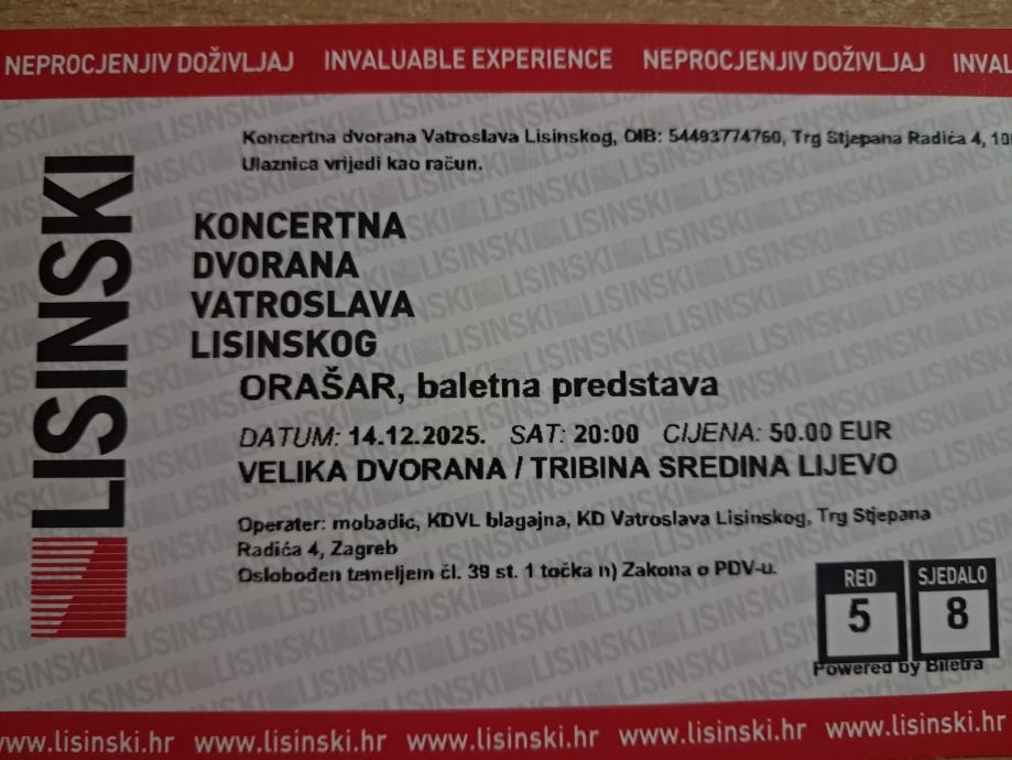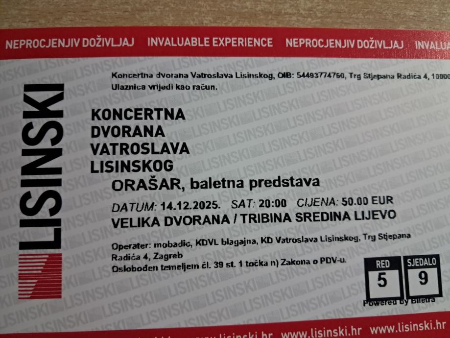 Prodajem dvije fizičke ulaznice za Orašara u Lisinskom 14.12.2025. u 20h. Cijena je 90€ za dvije ulaznice. Preuzimanje isključivo u Zagrebu.