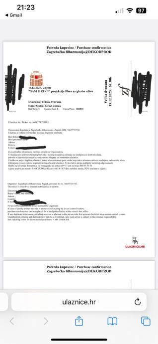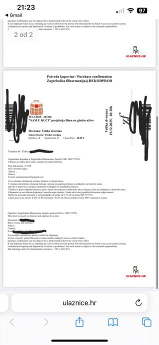 Prodajem dvije karte za projekciju filma Sam u kući zbog nemogućnosti dolaska.
