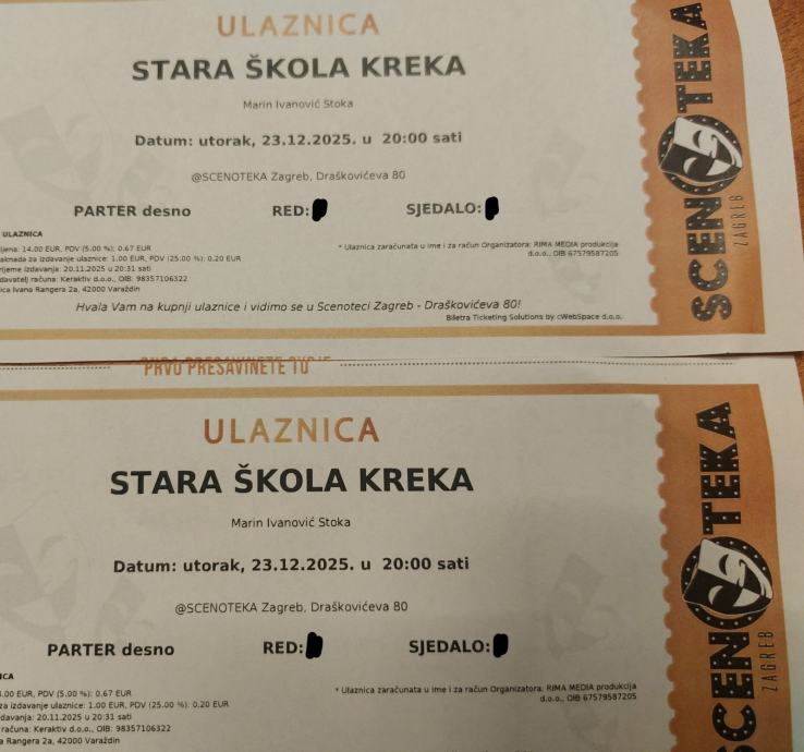 Prodajem 4 ulaznice za predstavu Stara škola kreka u Scenoteki (bivša Vidra u Draškovićevoj) u utorak 23.12. u 20 sati.