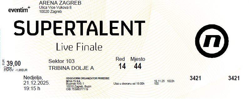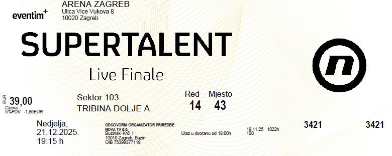 Karte/Ulaznice za live finale Supertalent u Areni Zagreb (3 kom)
