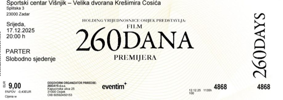 Prodajem 1 ulaznicu za film 260dana, Zadar Višnjik. 17.12. 20h