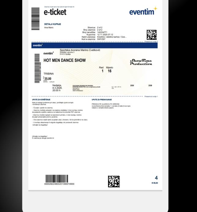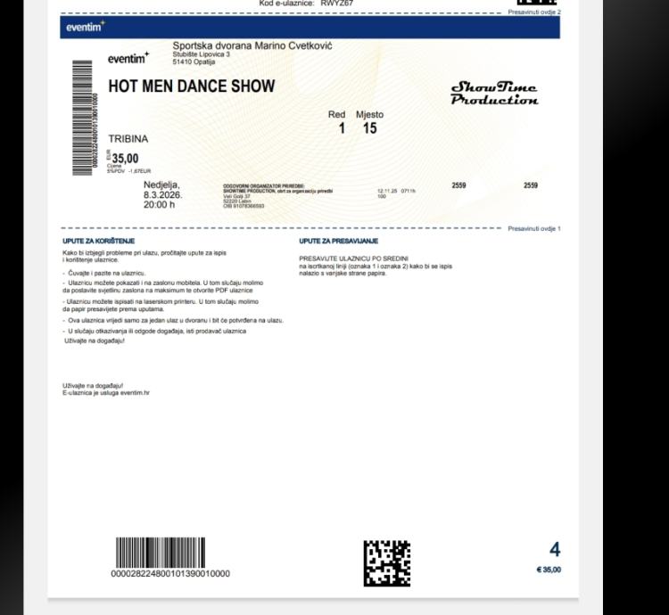 Prodajem 2 karte za Hot Men Dance Show Opatija