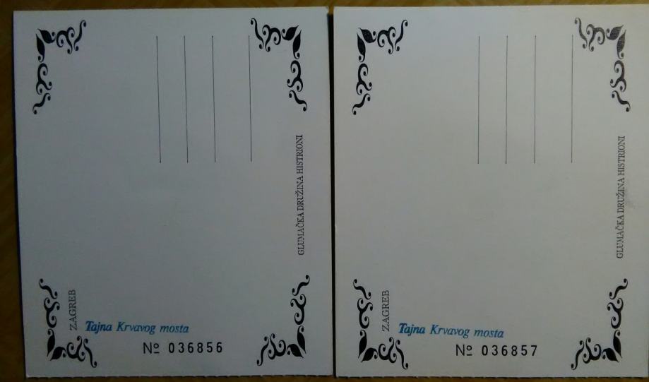 Dvije starije ulaznice za predstavu Tajna Krvavog mosta, Glumačka družina histrioni, Zagreb, serijski broj 036856/036857 te jedna ulaznica Histriona, za meni nepoznatu predstavu.. Stanje je vrlo dobro i vidljivo na fotografijama.
