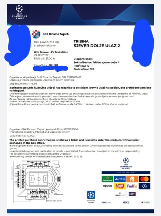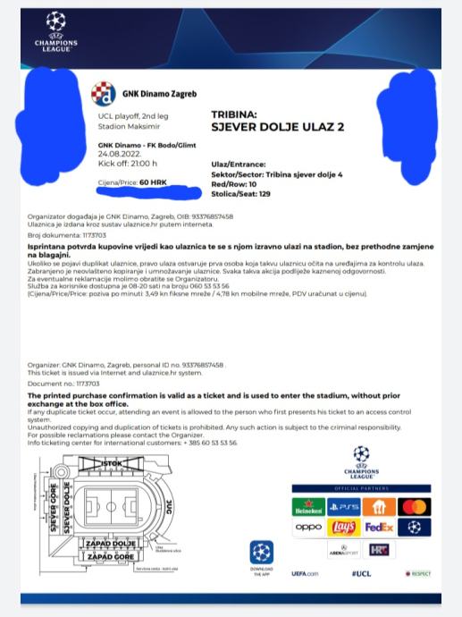 Prodajem 2 ulaznice za Dinamo-Bodo/Glimt finalnog playoffa za Ligu Prvaka.