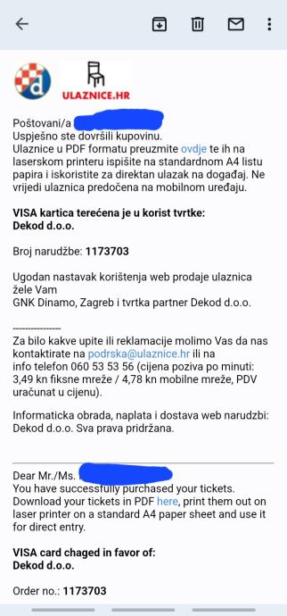 Ulaznice su u PDF formatu te ih mogu proslijediti putem emaila u slučaju dogovora za transakciju online putem. Plaćanje moguće putem PayPala.