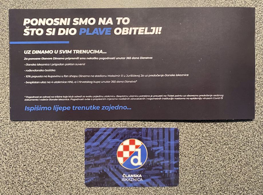 DINAMO - Članska iskaznica za 2023 godinu/10 mjesec (i taj mjesec), uz nju imate 4 besplatne karte za utakmicu HNL lige, 10% popusta u Dinamo Fan shopu, Dostava.