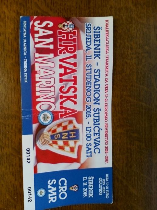 Ulaznica s utakmice hrvatska - san marino 4-0 odigrane 11.11.2015 u Šibeniku ..kvalifikacije za europsko prvenstvo u-21 reprezentacije... šaljem poštom ili tiskom nakon uplate na račun ..više ne šaljem pouzećem zbog neodgovornih pojedinaca ..