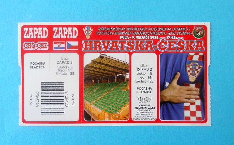 Prekrasna stara ulaznica sa međunarodne nogometne utakmice HRVATSKA vs ČEŠKA odigrane 2011. godine u Puli povodom otvaranja nogometnog stadiona "Aldo Drosina" u Puli.