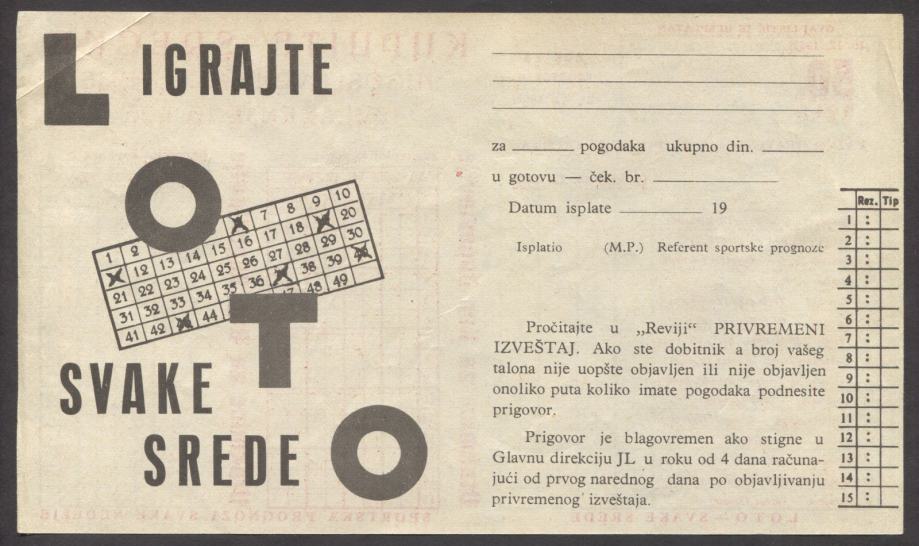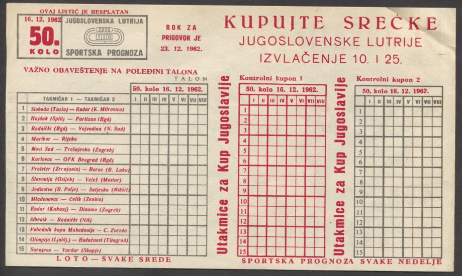 SPORTSKA PROGNOZA LISTIĆ IZ 1962.g. JUGOSLAVIJA