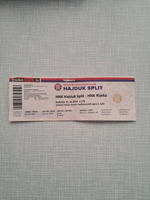 ulaznica hnk hajduk split-hnk rijeka 1.11.2015. u 17h stadion poljud