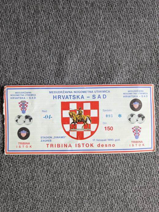 Original ulaznica s nogometne utakmice Hrvatska - SAD odigrane 17.10.1990. u Maksimiru. Prva povijesna utakmica hrvatske reprezentacije.