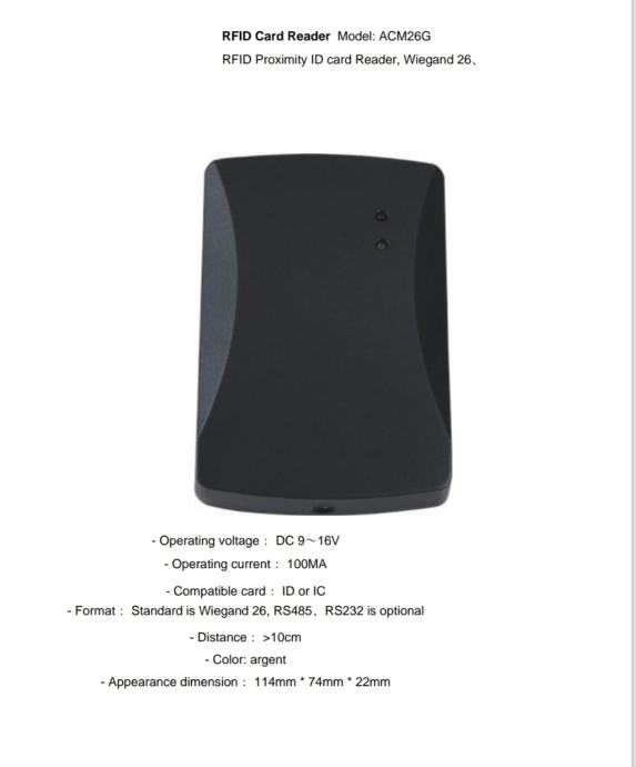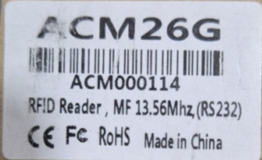 ACM26G RFID čitač, uređaj za kontrolu pristupa koji radi na frekvenciji od 13,56 MHz i podržava RS232 komunikacijsko sučelje.