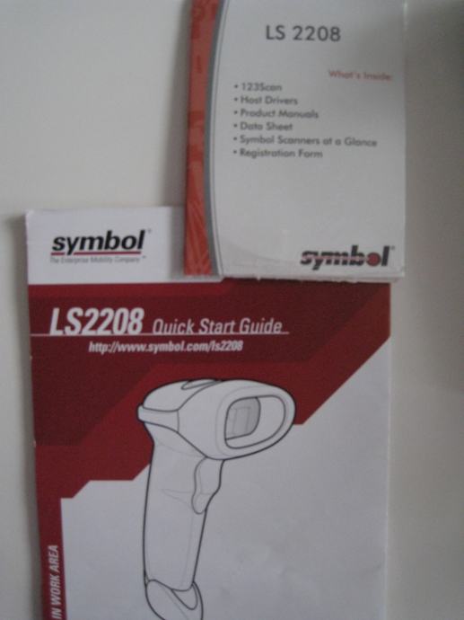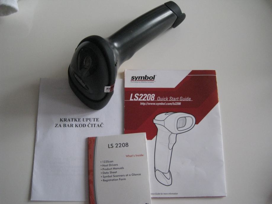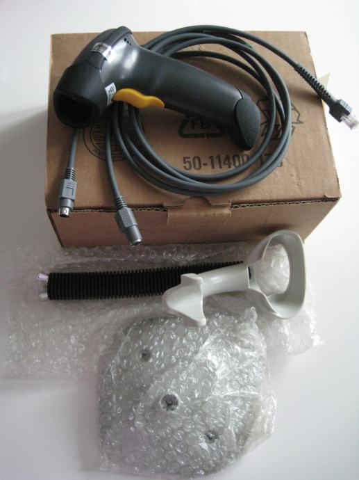 Novi, nekorišteni bar kod čitač LS 2208-crni, stalak je sivi.