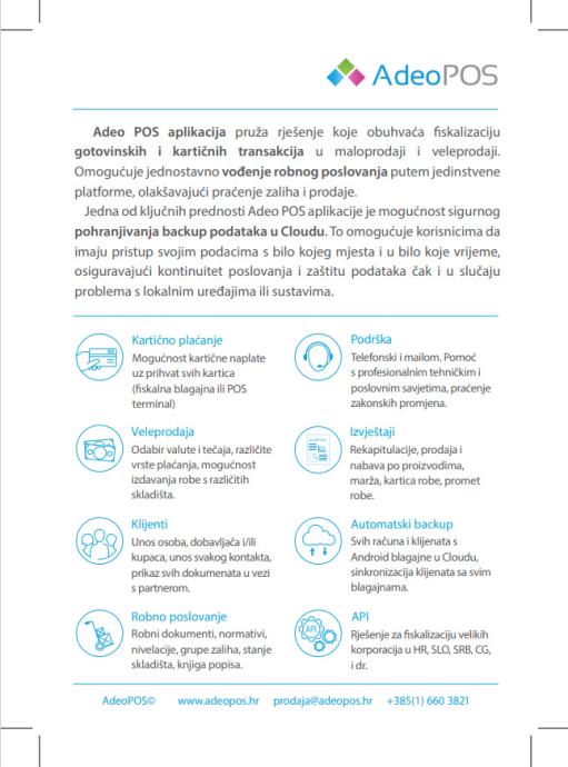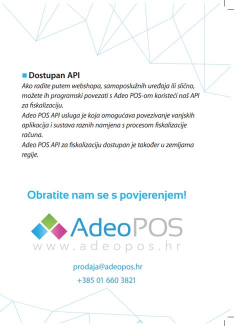 o Korisnik odabire artikle putem kioska ili Adeo POS blagajne i finalizira transakciju pritiskom na gumb „fiskaliziraj“.