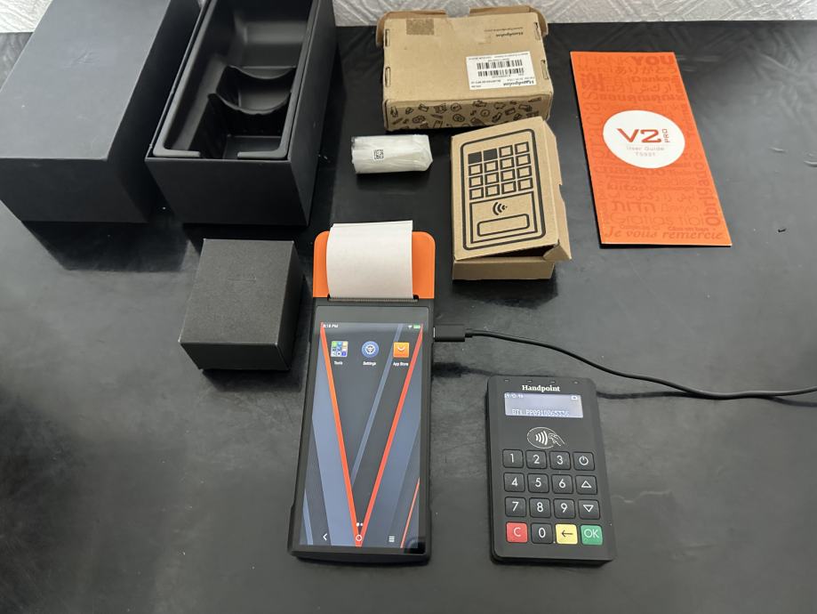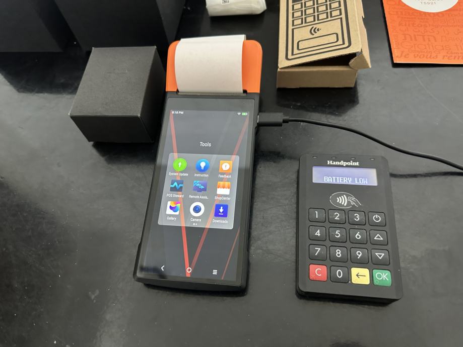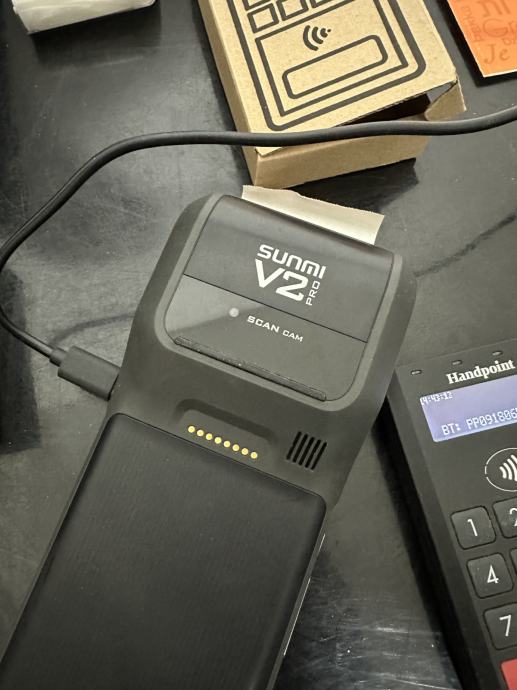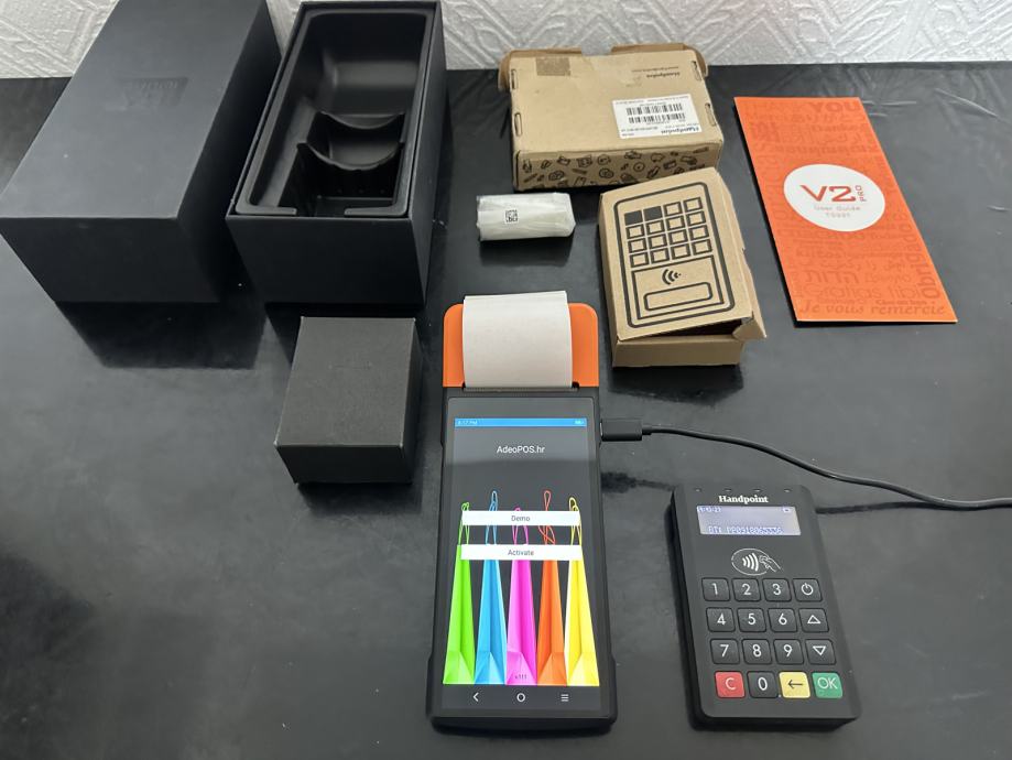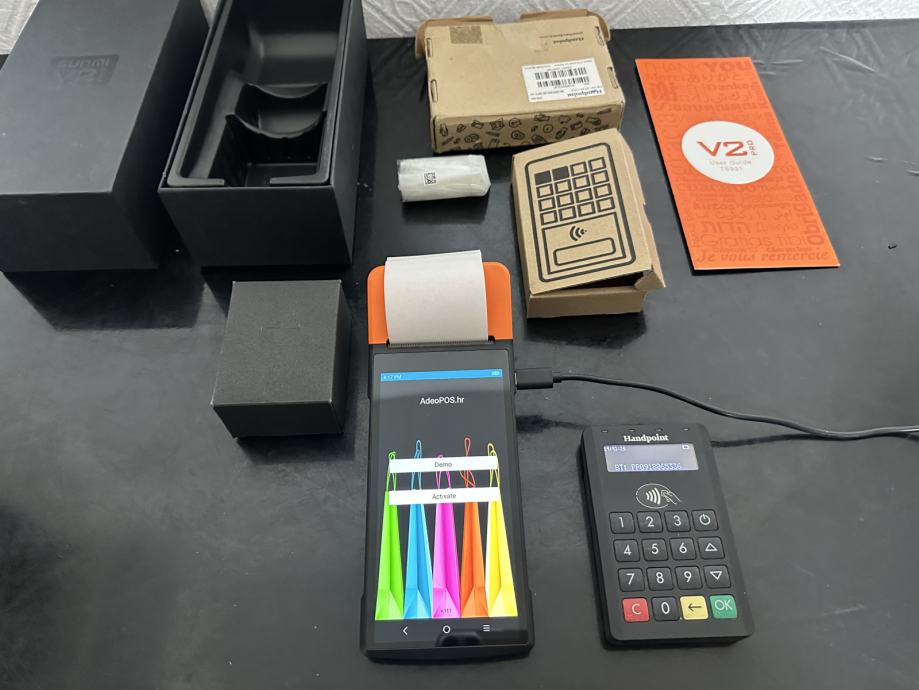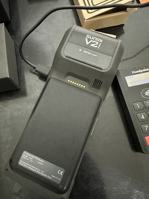 Prijenosna fiskalna blagajna SUNMi V2 PRO uz koju ide standalone uređaj za kartično plaćanje.