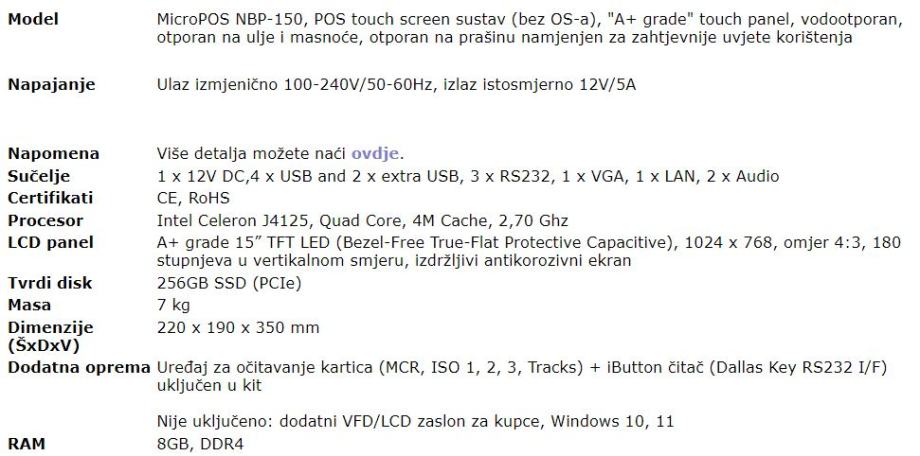Intel Celeron J4125, Quad Core, 4M Cache, 2,70 Ghz LCD panel A+ grade 15” TFT LED (Bezel-Free True-Flat Protective Capacitive), 1024 x 768, omjer 4:3, 180 stupnjeva u vertikalnom smjeru, izdržljivi antikorozivni ekran Tvrdi disk 256GB SSD (PCIe), Masa 7 kg, Dimenzije (ŠxDxV) 220 x 190 x 350 mm, RAM 8Gb, DDR4, Licenca Win 11 u kompletu -