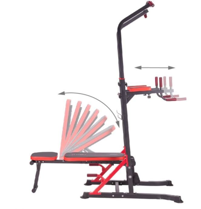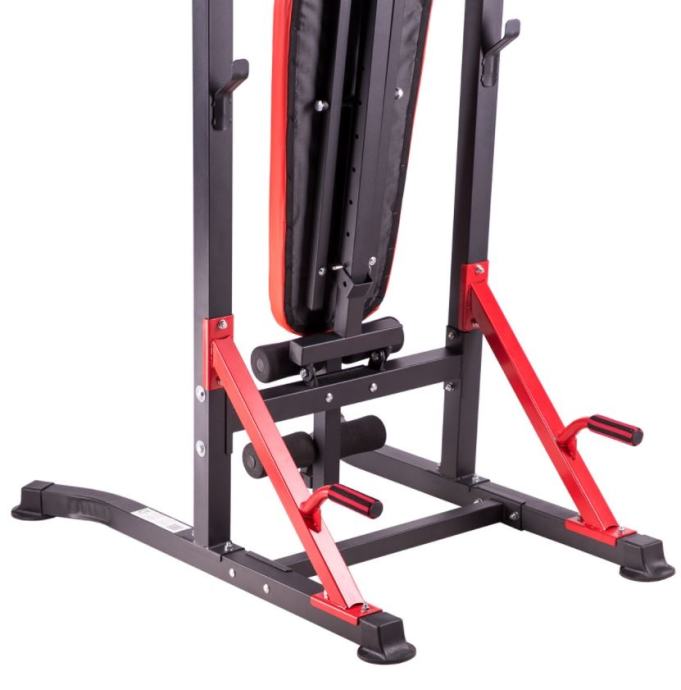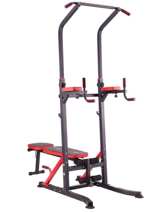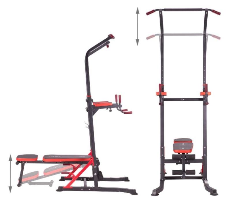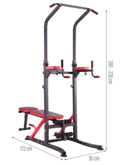 Stanica za vježbanje omogućuje različite treninge na 1 uređaju:• pull up vježbe• dip vježba• sve vježbe s klupe, bench press i druge metode dizanja utega• Vježba za stisak s ručkama na dnu• Vježbajte trbušne mišiće podizanjem ili istezanjem nogu• vježba trbušnih mišića na klupi (noge podvučene pod pjenu)• Ograđena klupa se može postaviti u kosi položaj za zahtjevnije trbušnjakeKlupa za vježbanje može se podesiti na drugačiji nagib naslona, može se postaviti i u okomit položaj.Dopuštena težina korisnika: 120 kgTežina artikla: 33 kgVeličina: 205 x 120 x 229 cm (visina)Utezi nisu uključeniMaterijal: čelik, EVA, PP, drvoDuljina: 172 cm, sa sklopivom klupom 114 cmŠirina: 95 cmVisina: 236 cmDimenzije šipke:Širina: 95 cmPromjer ručke: 33 mmDuljina ručke: 11 cmUdaljenost između ručki: 74,5 cmRazine podešavanja visine: 200 - 236 cm, 7 razina na svakih 6 cmDimenzije klupe:Ukupna dužina: 111 cmDužina naslona: 72 cmŠirina naslona: 31 cmDebljina naslona: 4 cmDužina sjedala: 31 cmVisina klupe: 43 cmSklekovi:Udaljenost između ručki: 55,5 cmNosivost: 150 kgTežina proizvoda: 30 kg