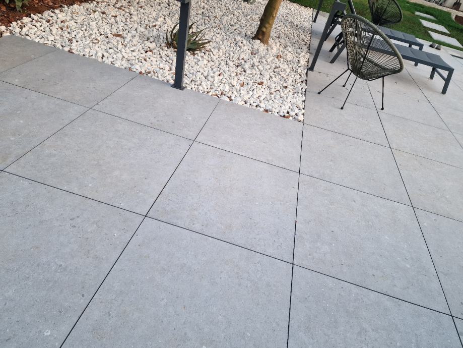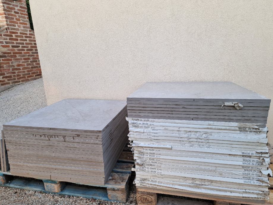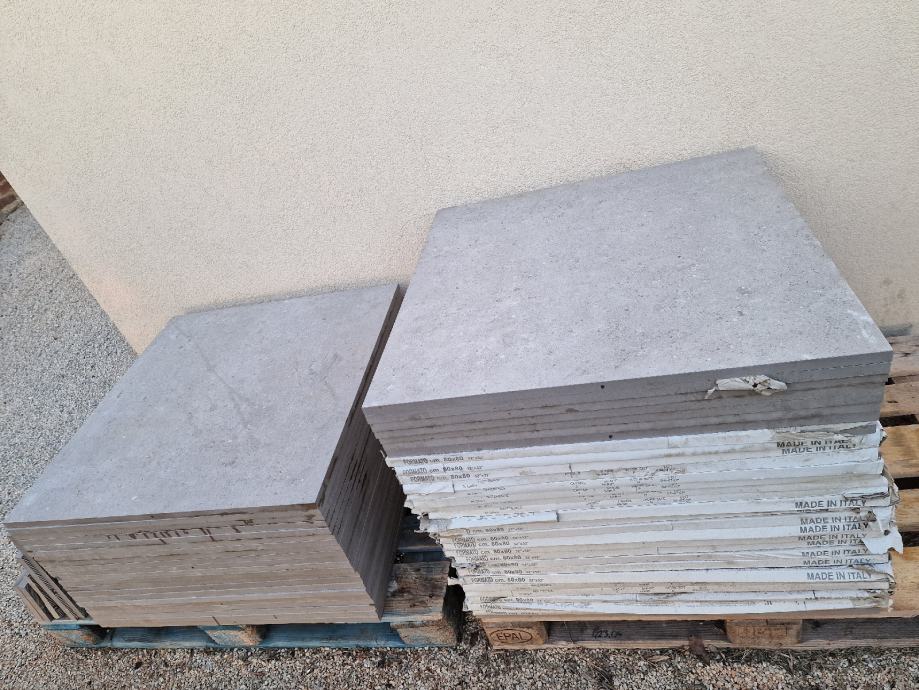 Pločice 80x80x2cm, sive, izgled betona, R11 protuklizne, laserski rezani rubovi, ostatak od gradnje, ima nešto manje oštećenih rubova prilikom transporta, dostupno cca 30m2. Cijena po m2/45 eura.