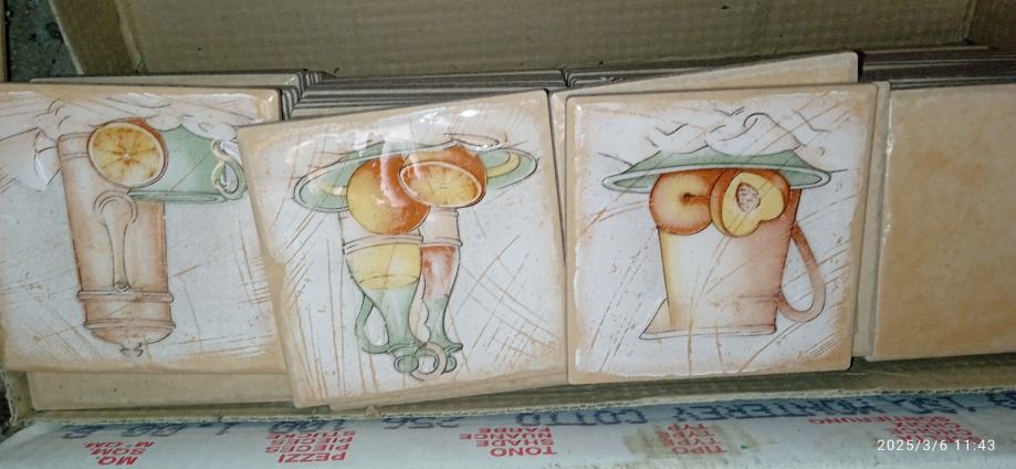 Talijanske kvalitetne pločice 10x10,imam 44 kvadrata i oko 34 pločica sa slikama kao dekoraciju,mogu poslati jos slika,cijena po kvadratu 6 eura plus dekoracije po pločici 8 eura,pločice su za kuhinju,zidne.