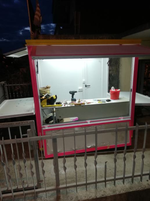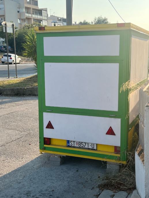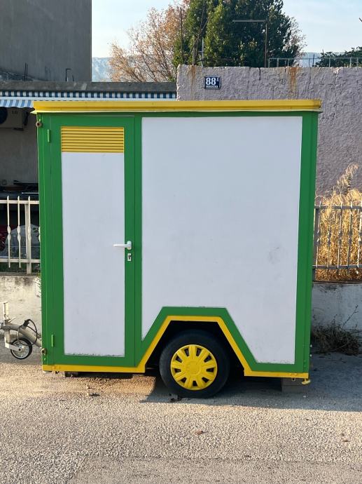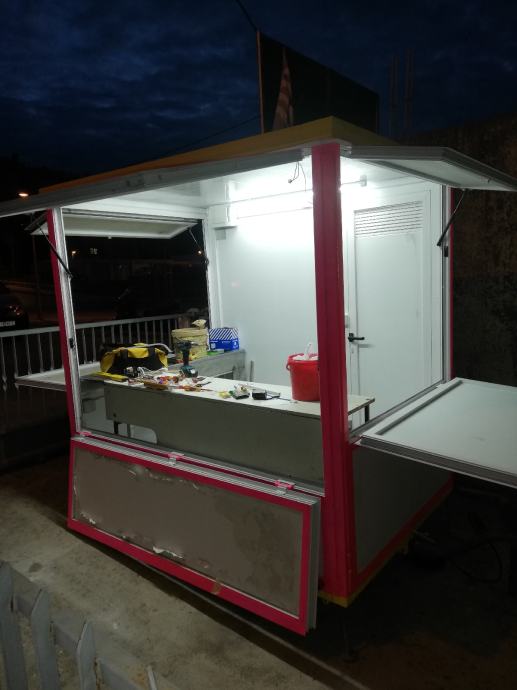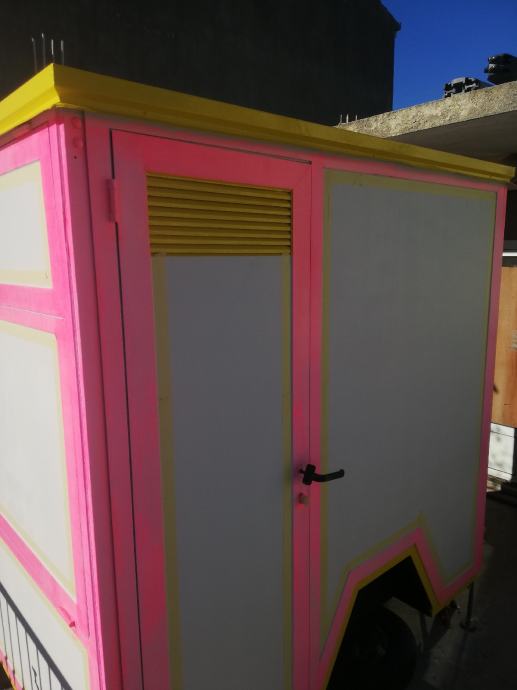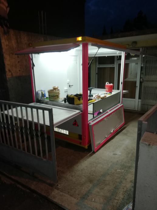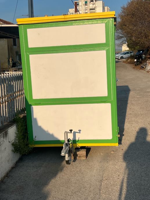 Prikolica ima sve ateste i minimalno tehnicke uvjete za prodaju sladoleda,pica i hrane moze bit i stand za suvenire)ima dva sudopera za vodu sa pipama i zatvorenim sistrmom vode i otpadnih voda, led rasvjeta sa uticnicama dim 220-165-210-