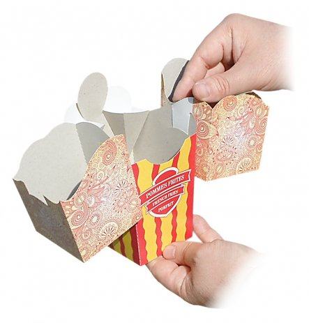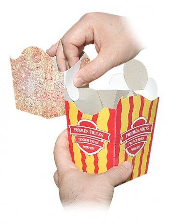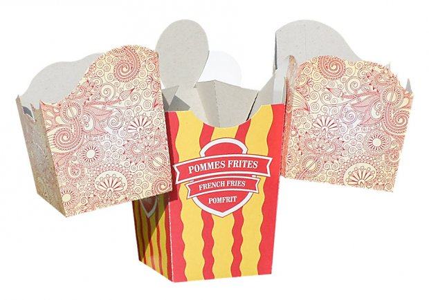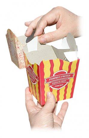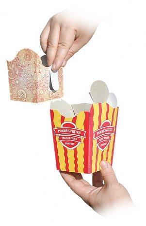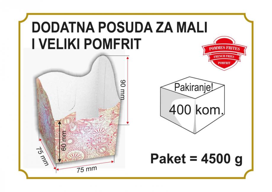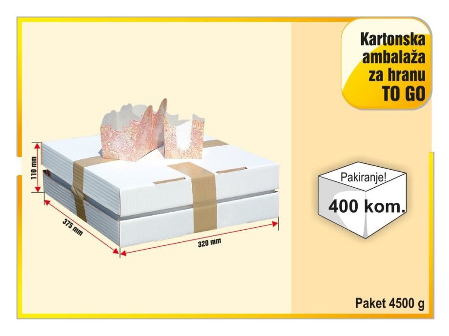 Novo na tržištu - kartonska ambalaža koja se zakači za našu ambalažu za pomfrit. Moguće je povezati dvije kutijice jednu sa drugom ili s našom osnovnom kutijom za pomfrit (manjim ili većom), Kutija ima samosloživo dno. Nakon korištenja ostaje samo papirnati otpad koji se u potpunosti reciklira. Može se koristiti za neku dodatnu hranu uz pomfrit. Cijena kutije iznosi 0,12 € po komadu, a pakirane su po 400 kom = 48€, (PDV uračunat). Kutije šaljemo u RH sa dostupnim dostavljačima ili za regiju sa nekim od dostavljača po dogovoru. Cijena dostave nije u cijeni kutija i ovisi o količini i odredištu. Pogledajte i ostale naše oglase.