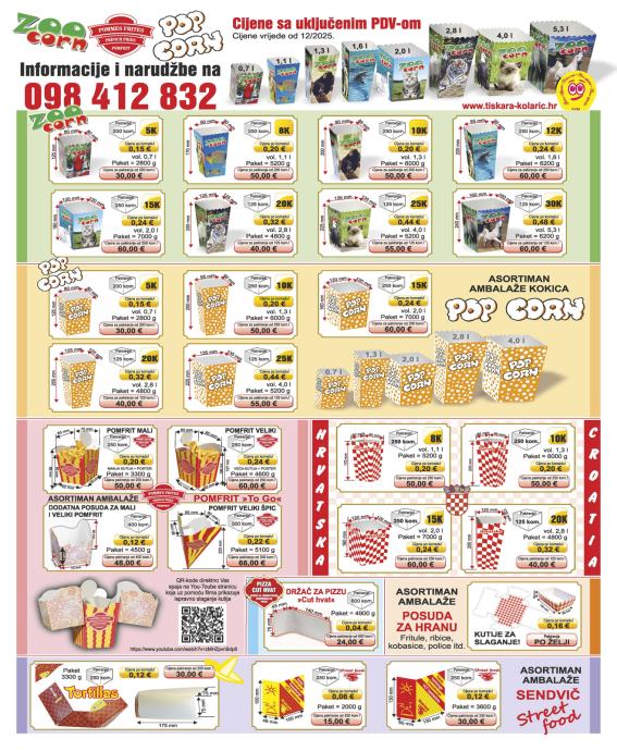 Kutje za kokice ZOO corn. Na svakoj kutiji ZOO corn 4 slike životinja (kućne, divlje, morske ...). Uz vrhunski dizajn i konkurentne cijene kutije Šaljemo u RH sa dostupnim dostavljačem ili za regiju sa nekim od dostavljača po dogovoru. Cijena dostave nije u cijeni kutija i ovisi o količini i odredištu. Za pojdinačne cijene i veličine kutija pogledati fotografije svakog proizvoda.