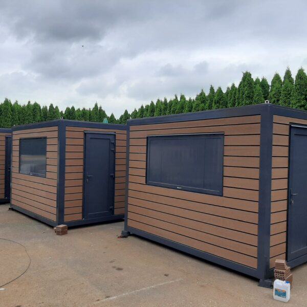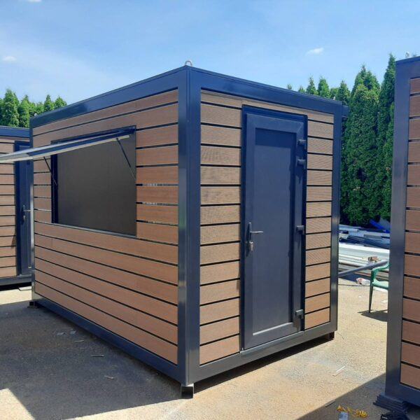 Prodajno – izložbeni kontejner / kućica izrađena je od metalne konstrukcije bojane temeljnim primerom i dvokomponentnom završnom bojom. Zidovi i krov su izrađeni od termoizolacijskog panela debljine 50 mm Podnica je izrađena od panela 50 mm ,OSB drvene obloge deboljine 22 mm i gumirana obloga sa završnim lajsnama i kutevima PVC vrata dim. 90×205 cm Podizna stjenka na amortizere sa bravicama za zaključavanje iznutra i ručkicama za lakše podizanje izvana na otvaranje dim 200×100 cm Provedene kompletne rlektro instalacije s LED rasvijetom i vanjskim napajanjem.Vanjska dekoracija sa WCP deckingom.