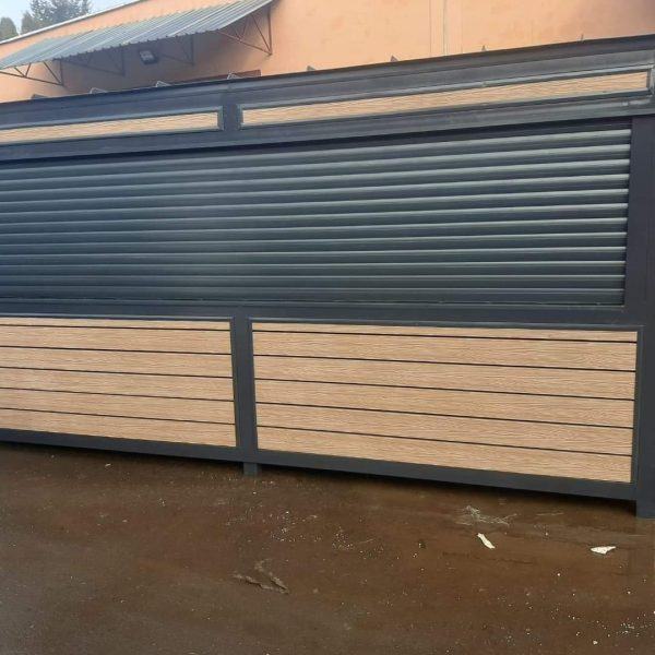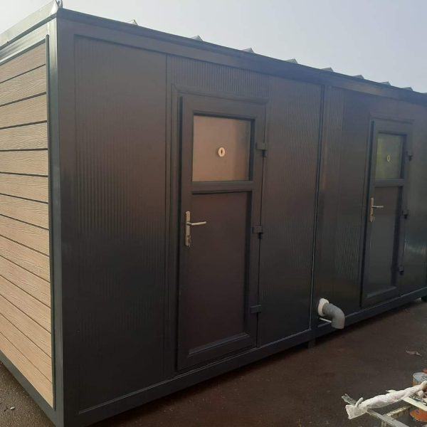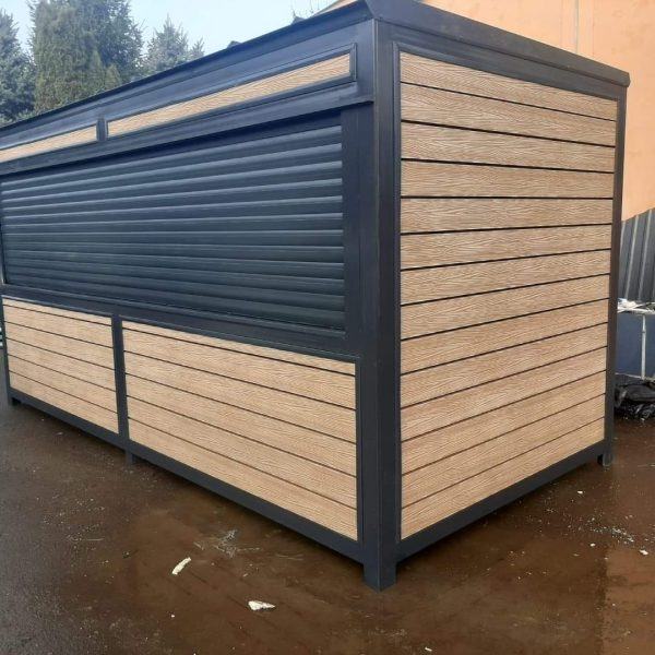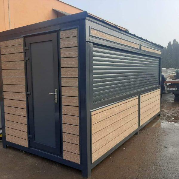 Prodajno – izložbeni kontejner / kućica izrađena je od metalne konstrukcije bojane temeljnim primerom i dvokomponentnom završnom bojom. Zidovi i krov su izrađeni od termoizolacijskog panela debljine 50 mm Podnica je izrađena od panela 50 mm ,OSB drvene obloge deboljine 22 mm i gumirana obloga sa završnim lajsnama i kutevima PVC vrata dim. 90×205 cm,rolo vrata 400*100cm, 2 sanitarna čvora. Provedene kompletne elektro instalacije s LED rasvijetom i vanjskim napajanjem.Vanjska dekoracija sa WCP deckingom.