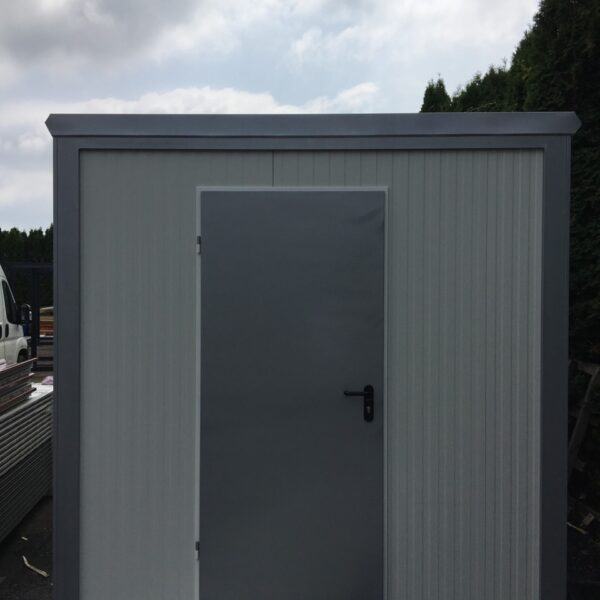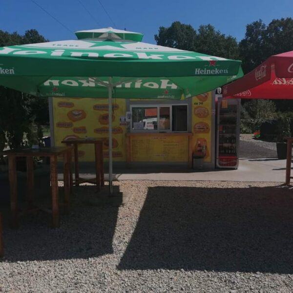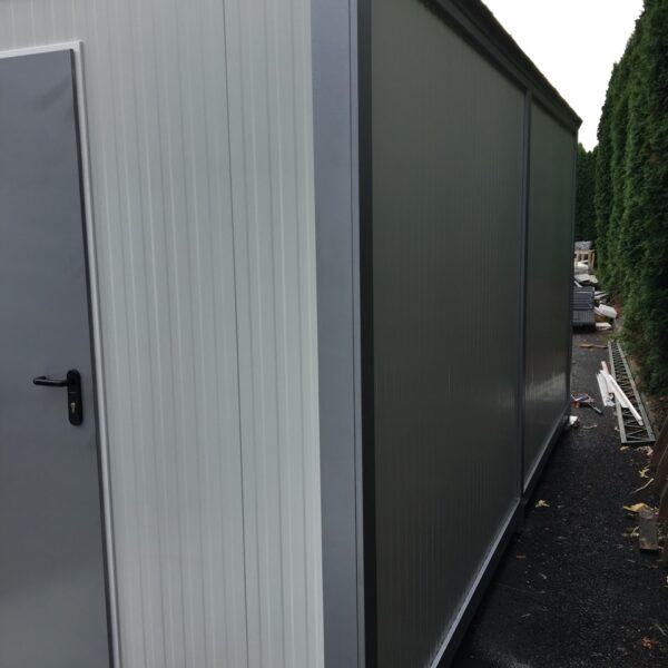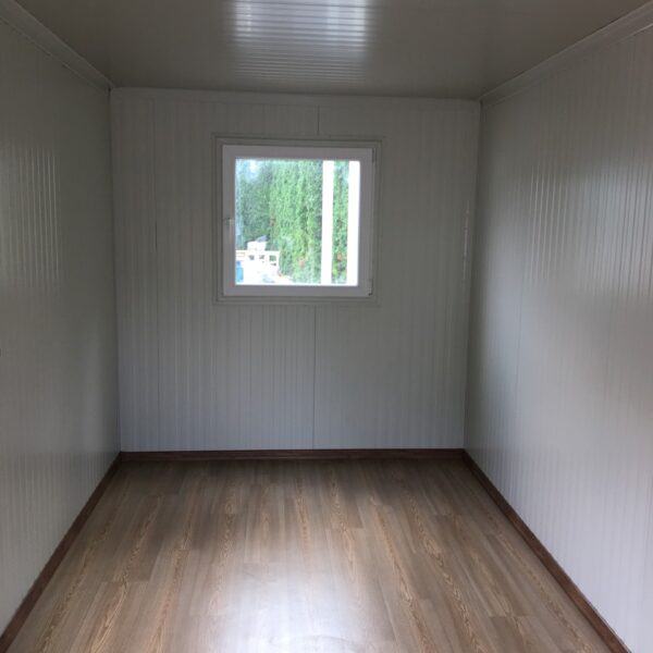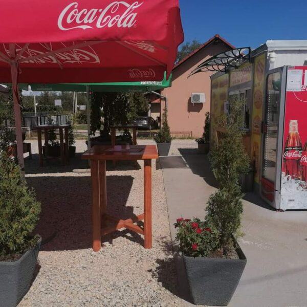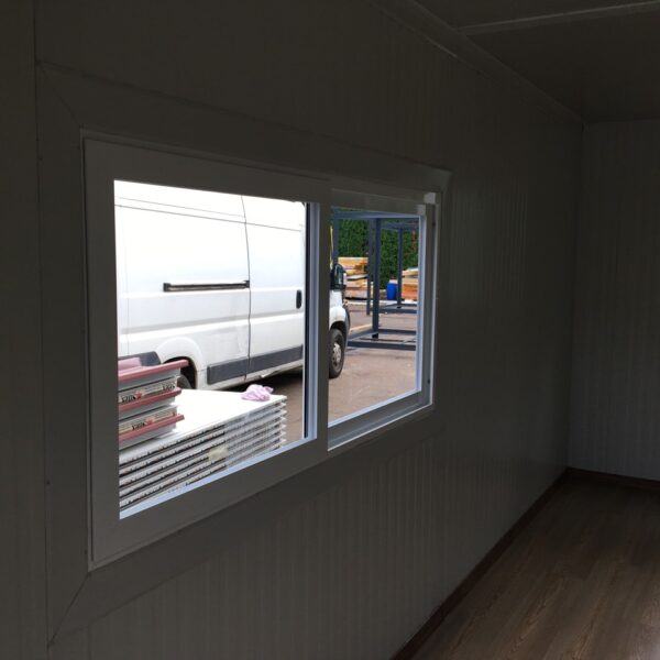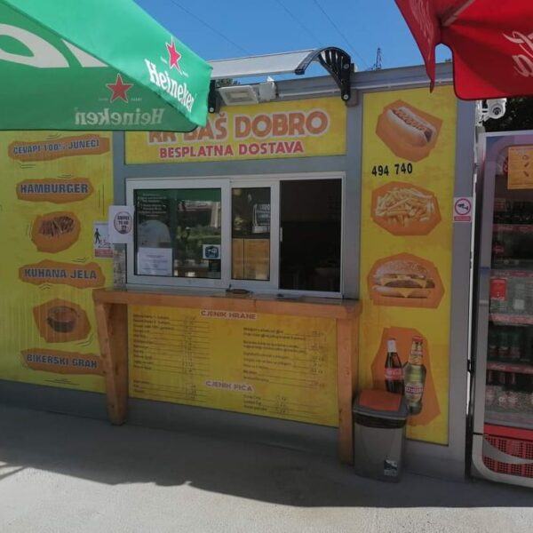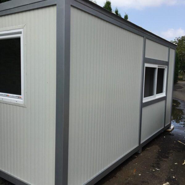 Prodajno – izložbeni kontejner / kućica izrađena je od metalne konstrukcije bojane temeljnim primerom i dvokomponentnom završnom bojom. Zidovi i krov su izrađeni od termoizolacijskog panela debljine 50 mm Podnica je izrađena od panela 50 mm ,OSB obloge debljine 22 mm i gumirana obloga sa završnim lajsnama i kutevima PVC vrata dim. 90×205 cm Podizna stjenka na amortizere sa bravicama za zaključavanje iznutra i ručkicama za lakše podizanje izvana na otvaranje prozor 120×100 s kliznim prozorčićem .Provedene kompletne rlektro instalacije s LED rasvijetom i vanjskim napajanjem.