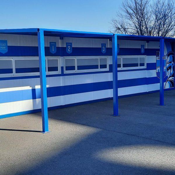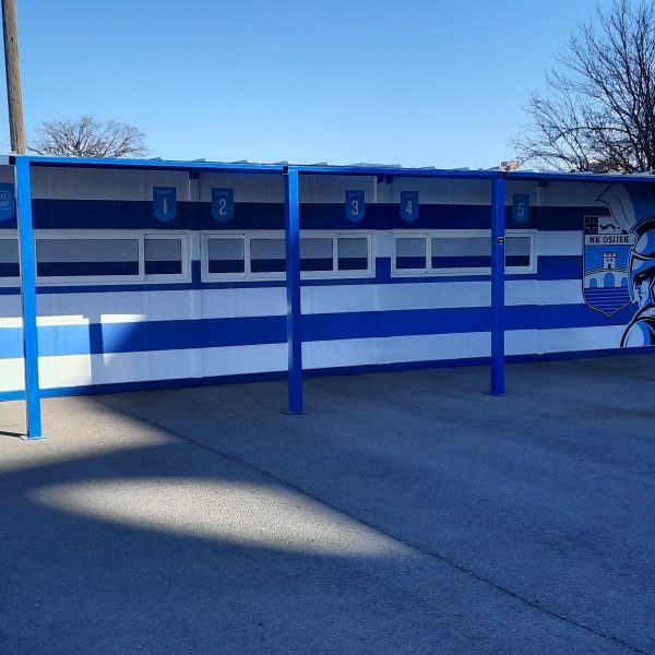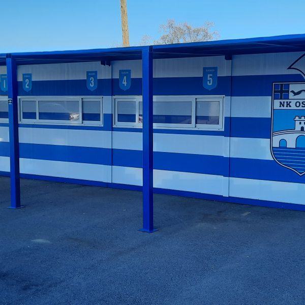 Prodajno – izložbeni kontejner / kućica izrađena je od metalne konstrukcije bojane temeljnim primerom i dvokomponentnom završnom bojom. Zidovi i krov su izrađeni od termoizolacijskog panela debljine 50 mm Podnica je izrađena od panela 50 mm ,OSB obloge debljine 22 mm i gumirana obloga sa završnim lajsnama i kutevima PVC vrata dim. 90×205 cm. PVC prozor 160×100 s otvorom od 50×50. Provedene kompletne elektro instalacije s LED rasvijetom i vanjskim napajanjem. ( Nadstrešnica nije u cijeni).