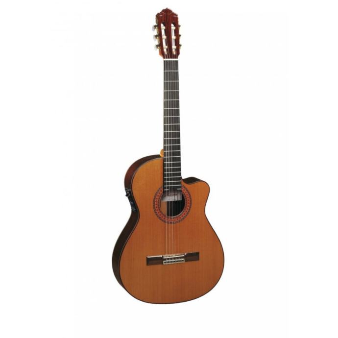 Almansa CW435E8 elektro-klasična gitara. 6-žičana gitara koju možete priključiti na pojačalo zahvaljujući Fishman Prefix Pro Blend pickup sistemu. Top Almansa CW435E8 elektro klasične gitare izrađen je od čvrstog crvenog cedra, zadnja ploča i bočne strane su od indijskog palisandera, vrat je od mahagonija ojačan ebanovinom, a hvataljka je od drveta ebanovine.