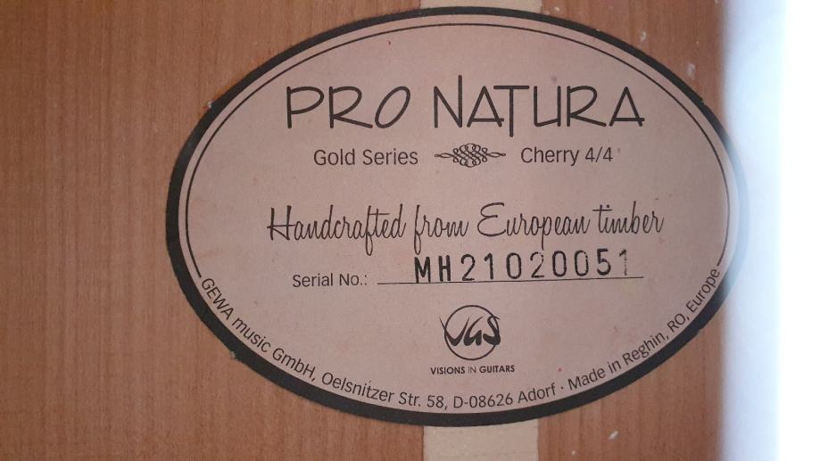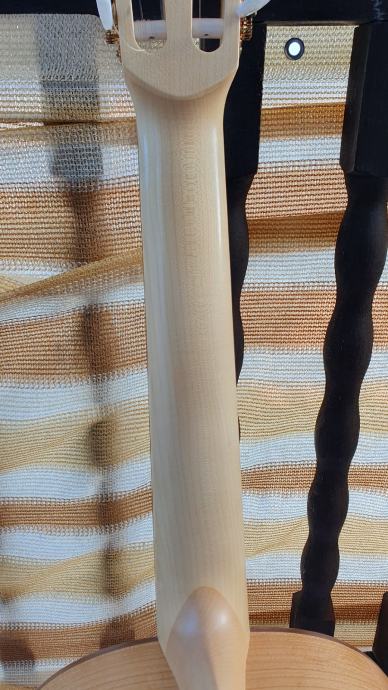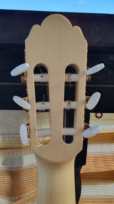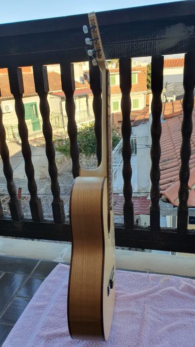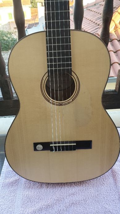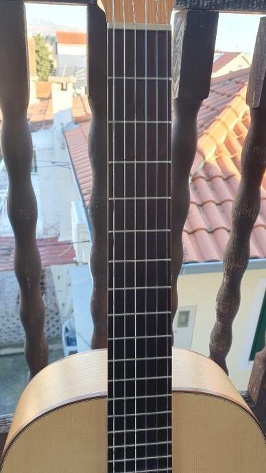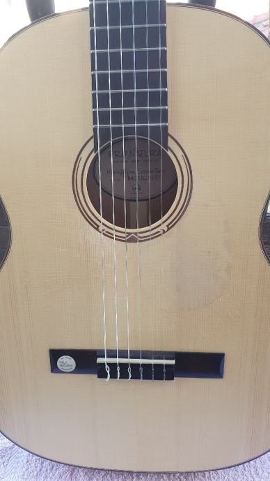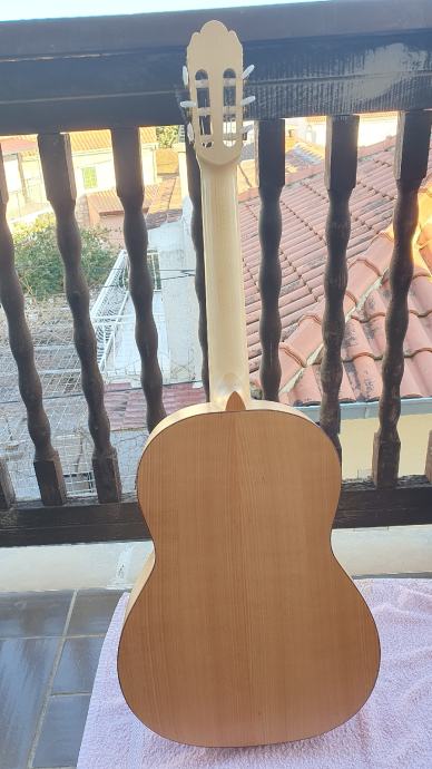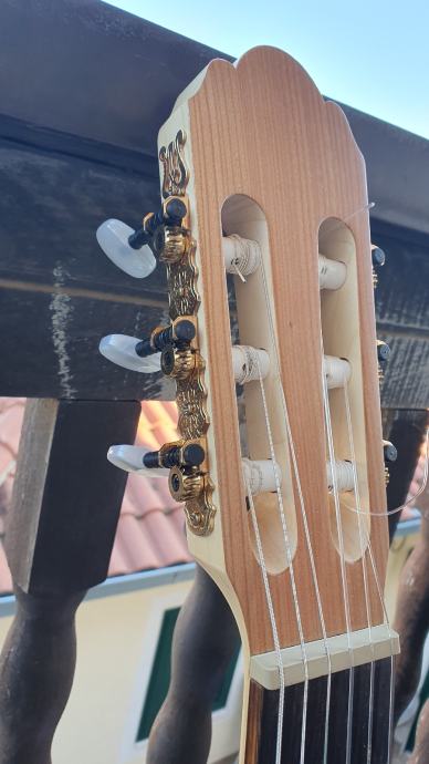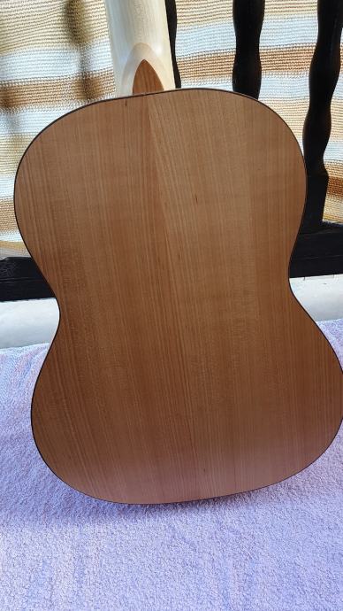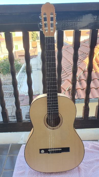 Klasična gitara ručno rađena od punog drva. Prednja ploča puna smreka, bočne i stražnja ploča trešnja. Vide se tragovi od trzalice