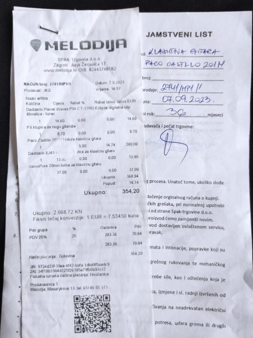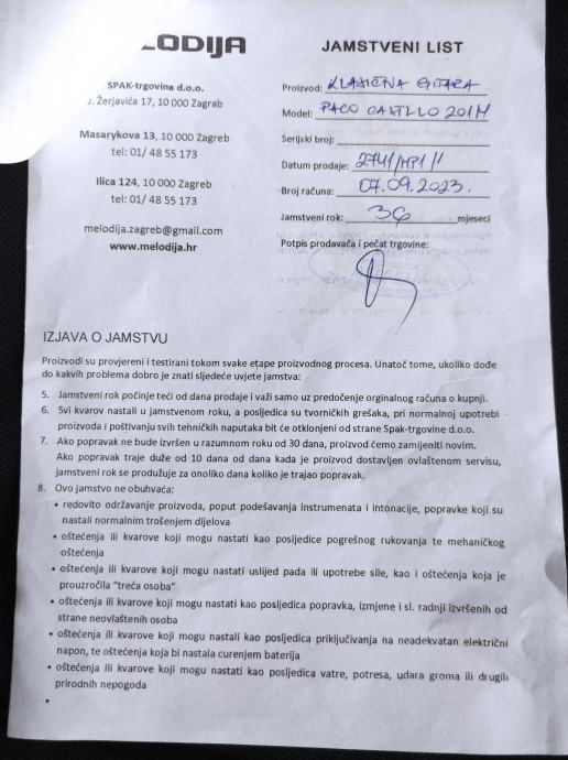 Gitara kupljena u Zagrebu prije 2 godine, sa računom i garancijom koja traje još godinu dana. Kćer ju je koristila, razlog prodaje je odustajanje od glazbene škole. U paketu dolazi i torba i stalak za nogu.