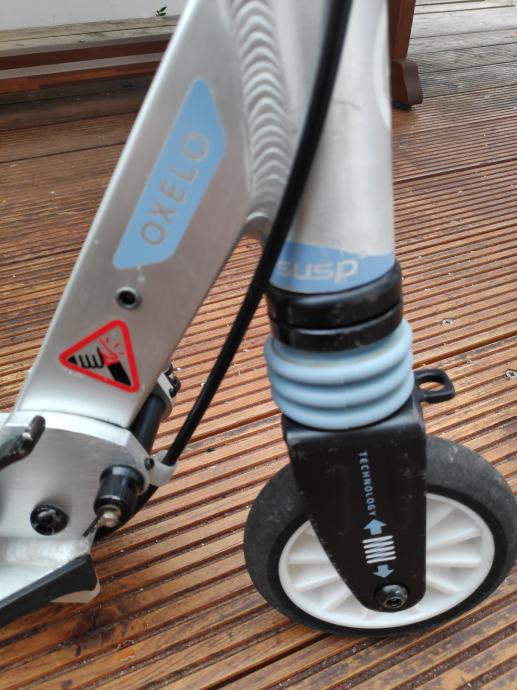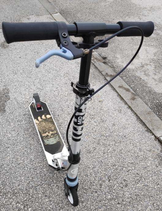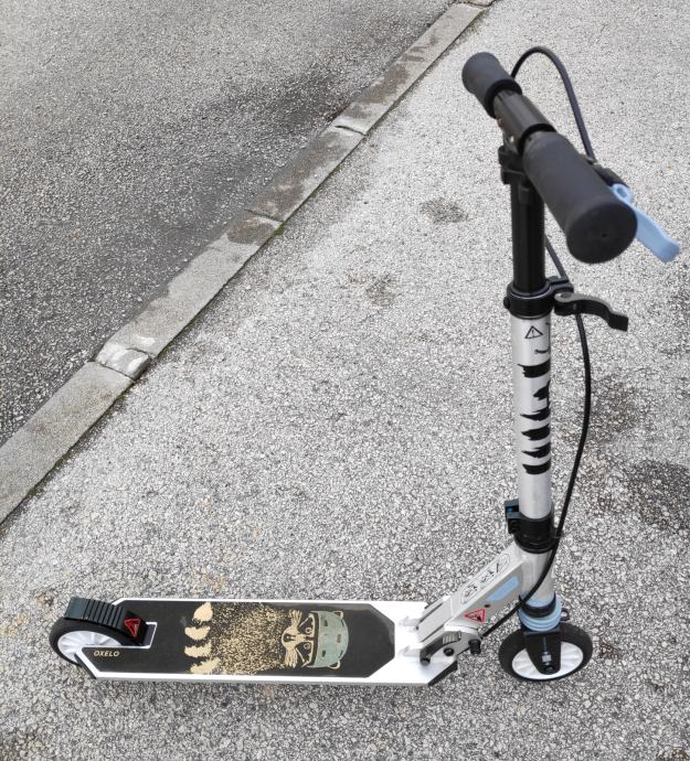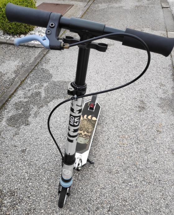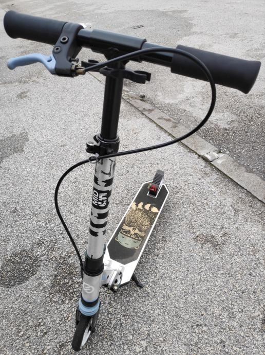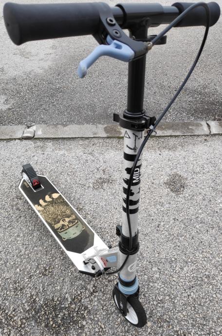 Prodaje se gore navedeni dječji romobil za djecu od 6 do 9 godina starosti (110-150 cm visine). Romobil je pažen i očuvan što se može vidjeti na slikama. Romobil posjeduje prednju suspenziju za ublažavanje neravnina prilikom vožnje, te kočnicu na upravljaču i nožnu stražnju kočnicu. Upravljač je podesiv po visini te tako prati rast djeteta. Romobil se može vrlo lako i jednostavno sklopiti za lakši transport. Kotači su veličine 12.5 cm,a maksimalno opterećenje romobila je 100 kg.