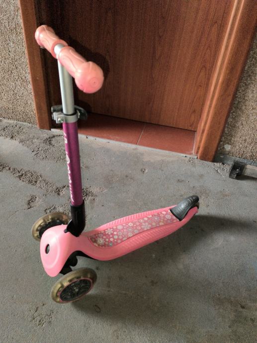 Prodajem dječji romobil u rozoj boji. Romobil ima tri kotača za bolju stabilnost, s rozom daskom i ručkama te ljubičastom središnjom cijevi. Pogodan je za manje dijete koje tek uči voziti romobil.
